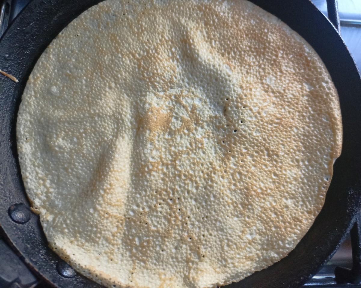Разогрейте сковороду, лучше с антипригарным покрытием с небольшим количеством растительного масла. Налейте немного теста на сковороду и распределите круговыми движениями по всей поверхности сковороды. Подробнее о выборе сковороды читайте в статье под рецептом.