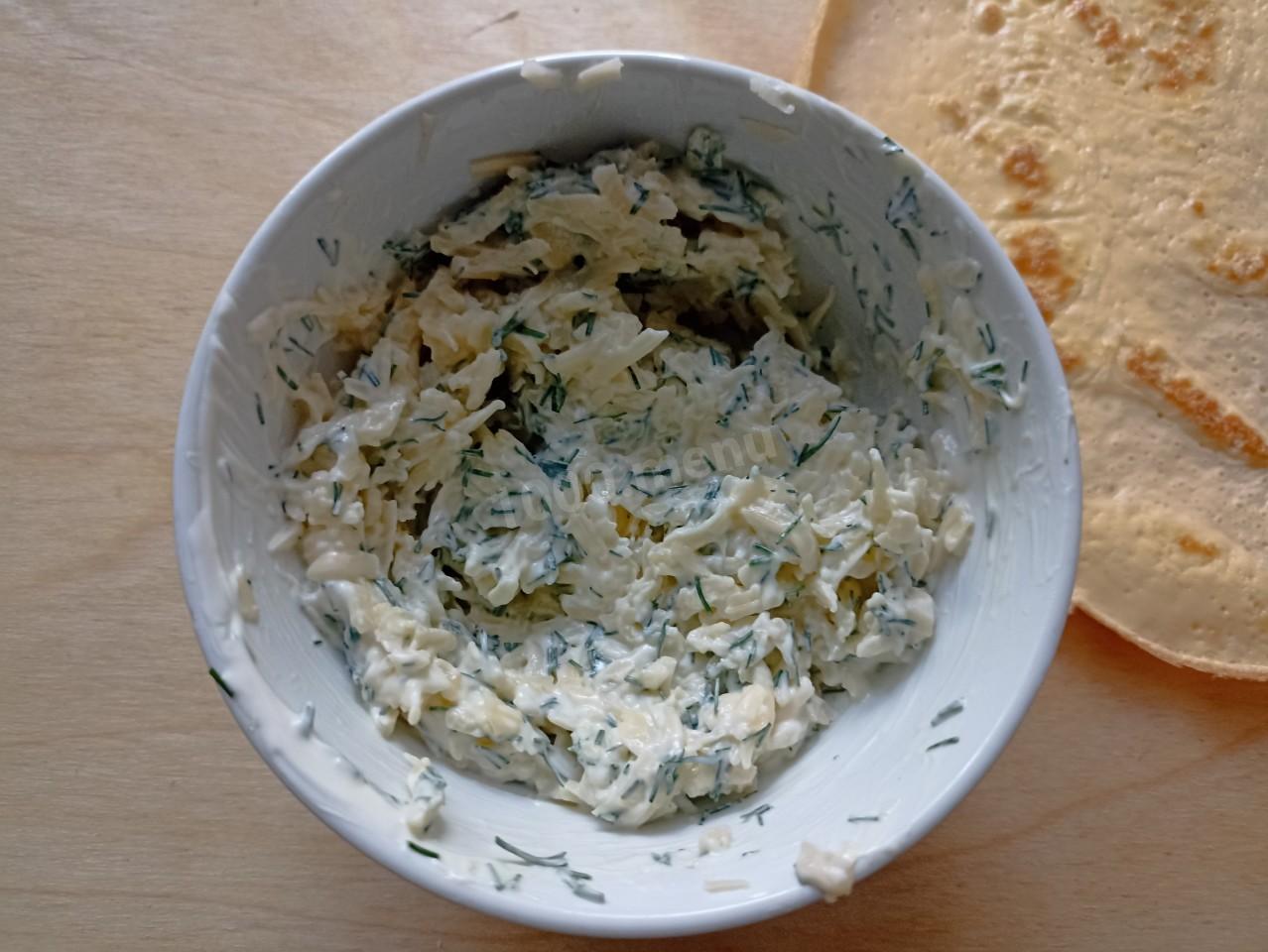 Приготовьте намазку, смешав натёртый сыр, зелень укропа и майонез.