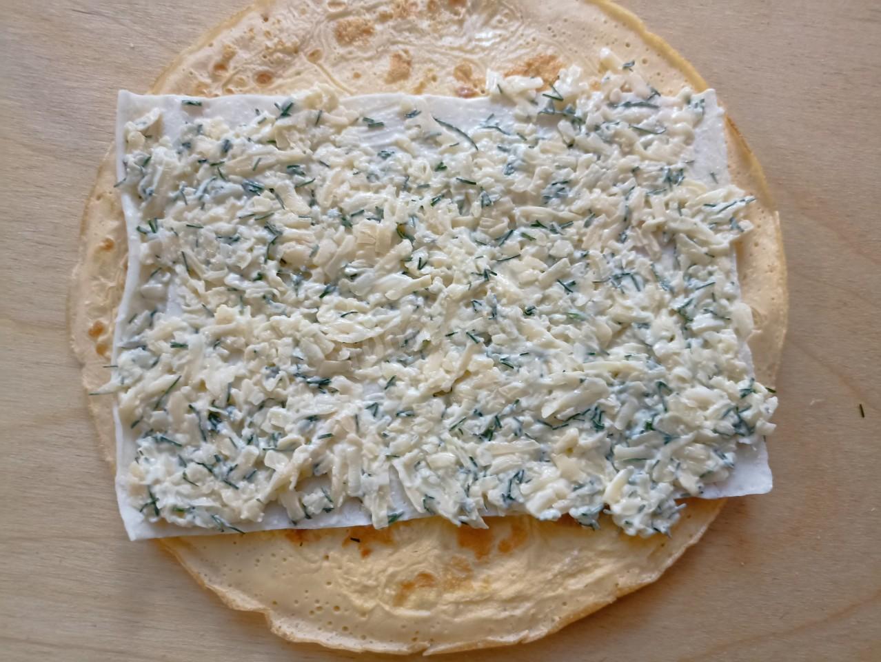 Мелко измельченные сыр и укроп отлично выкладываются и удобно, красиво заворачиваются в рулет.