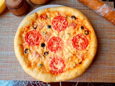Начинку я немного поменяла, добавила в пиццу нарезанный кусочками копчёный окорок, оливки и помидор. Соус сделала из майонеза смешанного с домашним томатом. Все это хорошо присыпала натертым на мелкой тёрке сыром.