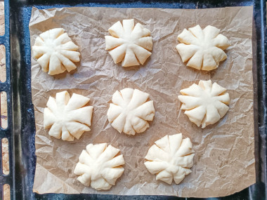 Разделила тесто на 8 частей, примерно по 95 гр каждая. Каждую скатала в колобок и по краю ножом сделала «лучики». Оставила заготовки на 15 минут на расстойку, затем смазала взбитым яйцом и присыпала сахаром. Выпекала булочки при 180 градусах 20 минут.