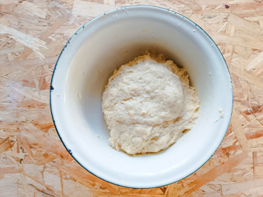 Добавляем соль и постепенно вводим просеянную через сито муку, сначала вымешивая тесто ложкой, а затем уже вручную. Подсыпаем муку до тех пор, пока тесто не станет мягким и не соберется в один ком. При этом тесто может немного подлипать к рабочей поверхности, в этом нет ничего страшного, так как большое количество муки «забьет» тесто и не позволит приготовить из получившего теста пышные пирожки. Регулируйте количество муки по консистенции теста!