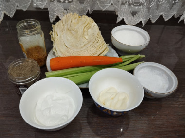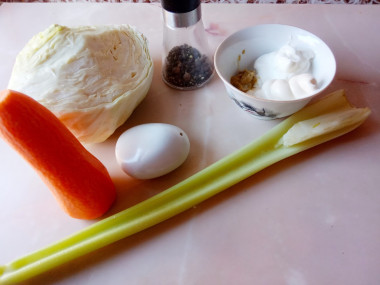 Калорийность продуктов: Капуста белокочанная, Морковь, Стебель сельдерея, Сметана, Майонез, Горчица, Соль, Перец черный молотый, Сахар