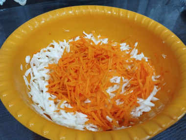 Морковь почистите и промойте. Натрите морковь на средней или мелкой тёрке. Я использовала тёрку для моркови по-корейски. Отправьте измельчённую морковь в миску к капусте.