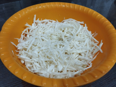 Снимите с капусты верхние уведшие и подпорченные листья, обмойте её и мелко нашинкуйте. Измельчённую капусту сложите в глубокую миску.
