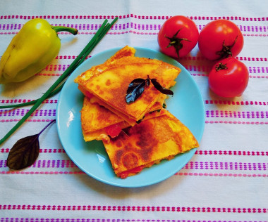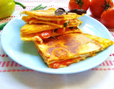 Давно хотела приготовить что-нибудь в тонких лепешках. В магазине выбрала сырные лепешки небольшого размера, как раз по диаметру моей сковороды. Приготовила тортилью на завтрак на двоих человек. Действительно, все готовится супер быстро) Сковородку я смазала растительным маслом, мне захотелось хрустящую золотистую корочку. Начинка такая же как и в рецепте. Помидоры прекрасно подходят для этой цели, а зеленый лук почти не чувствуется. Самое приятное, это сыр! Он так аппетитно растягивается тонкими ниточками) Корочка хрустит, начинка сочная, нежная. И все вместе очень вкусно и сытно. Мне рецепт понравился, буду готовить тортилью еще.