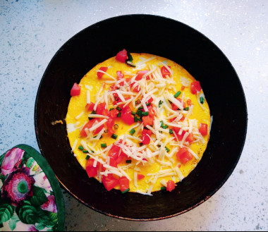 Яйца разбейте в миску, посолите, поперчите их и тщательно перемешайте вилкой до однородной массы. Аккуратно вылейте яйца на тортилью, которая лежит на сковороде. Закройте сковороду крышкой и жарьте лепешку в течение 5-7 минут. Яйца должны практически полностью приготовиться.