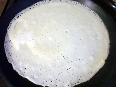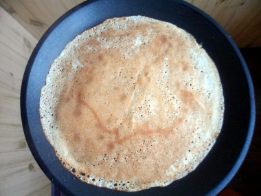 Вылейте на сковороду немного теста и наклоняя ее распределите по всему дну сковороды ровным кругом. Чем меньше наливаете теста, тем тоньше получатся блинчики. Огонь должен быть средний или немного меньше. Обжаривайте блин около 1 минуты с одной стороны, пока не зарумянится. Ориентируйтесь на мощность и особенности своей плиты.