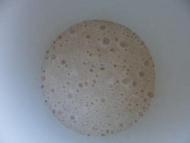 Также, перед использованием в выпечке, закваску надо подкормить мукой. То есть в нашу закваску добавьте 1 ст. ложку муки, перемешайте и поставьте минут на 30. Через указанное время она должна начать пузыриться. Замечу, что для выпечки на закваске подходит не каждая мука: мука должна быть не белоснежная, такая мука не позволит изделию подняться при выпечке. Мука должна быть слегка кремового цвета (как правило, это 1-2 сорт муки).