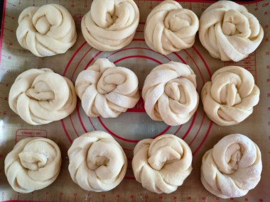 Сформируйте таким образом все булочки и выложите их на смазанный маслом противень. Дайте булочкам расстояться в течение 10-15 минут.