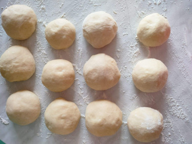 Тесто обомните и выложите на стол, присыпанный мукой. Разделите тесто на равные части, количество которых будет зависеть от желаемого размера булочек. Я разделила на 12 частей.