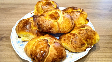 Пышные сладкие булочки в духовке получились, мягкие, пушистые. Мне немного не хватило сахара. Но это каждому индивидуально. Смазывала желтком с молоком. У меня тесто получилось не такое плотное, как у автора на фотографии, но больше муки я не стала добавлять, побоялась «забить» тесто. Булочки приготовились быстро, время точно не засекала, но вроде 20 минут. Результат понравился, рецепт рекомендую.