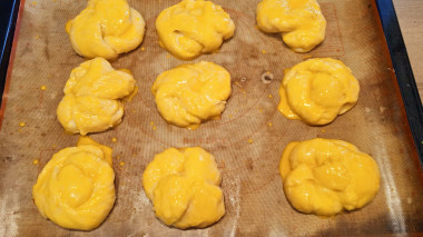 Смажьте булочки сверху смесью желтка и молока (сметаны) с помощью кулинарной кисточки.