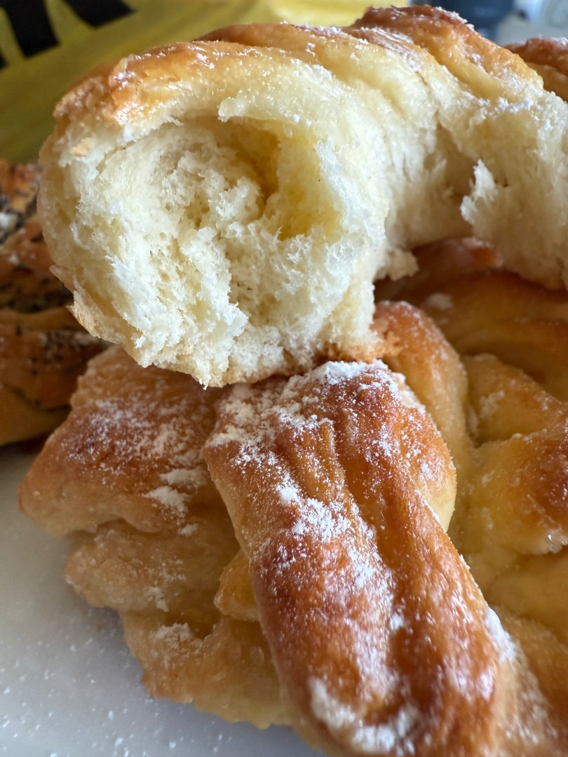 , вышло 12 булочек. Половину из них я посыпала сахарной пудрой, а вторую половину полила растопленным шоколадом. Булочки получились отменными! Очень нежные и воздушные с золотистой корочкой! Безумно вкусные и мягкие! Устроили семейное чаепитие