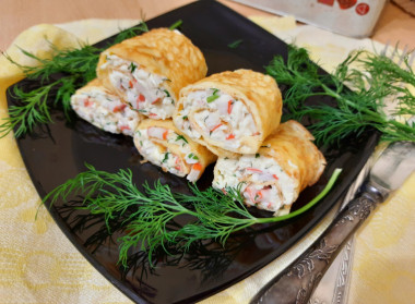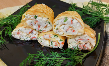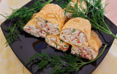 Вместо отдельных блинчиков можно приготовить в духовке один большой яичный пласт. Для этого нужно точно также приготовить тесто и вылить его на застеленный пергаментов противень. Тесто само распределится равномерно. Выпекайте около 10 минут при 180 градусах. Затем переверните на полотенце и охладите. Весь пласт промажьте крабовой начинкой, сверните рулетом и уберите в холодильник. Затем нарежьте рулет кусочками.