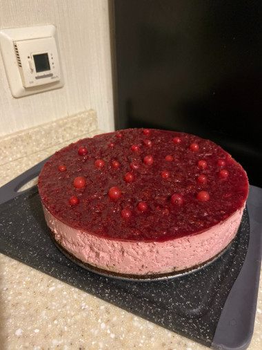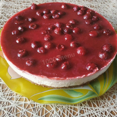 Аккуратно залейте вишнево-желатиновой смесью готовый чизкейк, стараясь не повредить полузастывший сырный слой. Чизкейк затяните пленкой и верните в холодильник на ночь.