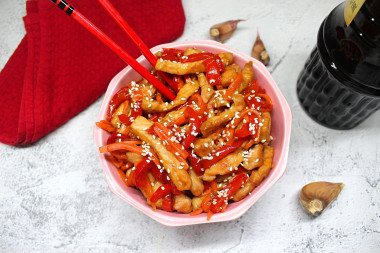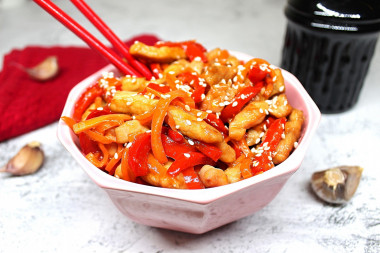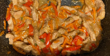Огромное спасибо автору за этот рецепт! Я очень люблю сочетание кисло-сладкого. Блюдо получилось очень вкусным: мясо нежное, овощи прожарены как надо, соус бомба. С рисом такая свининка заводит на ура! Я не очень люблю имбирь, поэтому даже молотый добавлять не стала, также исключила острый перец, крахмал я использовала картофельный, чесночек я мелко порезала и после жарки извлекать из сковороды его не стала. В следующий раз вместо рафинированного масла я попробую добавить кунжутное, мне кажется, так блюдо станет еще более ароматным. Еще мне кажется, если отварить специальную лапшу удон и перемешать с этим мясом, то получится отличная лапша wok. Подводя итог, могу сказать, что этим рецептом я еще не раз воспользуюсь!