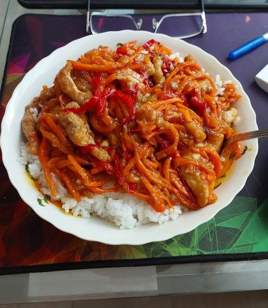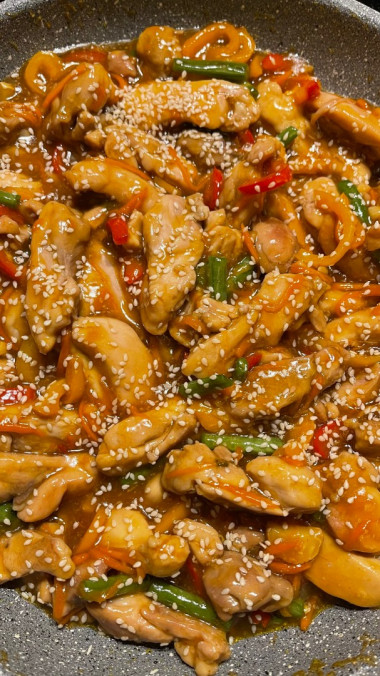Спасибо за рецепт, в принципе все по рецепту кроме следующего: вместо рисового уксуса взяла яблочный (нет у нас рисового в городе), вместо свинины курица и добавила свежую стручковую фасоль. Вышло шикарно, похоже на китайское блюдо в соусе Кантониз( Cantonese style).