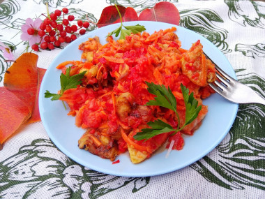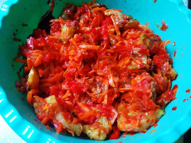 Мы с мужем очень любим подобные салаты-закуски. Салат с баклажанами я уже готовила похожим способом. С прошлого раза запомнилось, что баклажаны, нарезанные брусочками у меня больше не пожарились, а потушились. Поэтому на этот раз я их нарезала на кружочки. Шкурку пришлось счистить, она была не приглядной. Баклажаны я посолила и оставила, чтобы появился сок. На фото видно какой коричневый сок выделяется вместе с горечью. Когда обжаривала баклажаны решила, что кружочками не удобно будет есть и разрезала их пополам) Морковь натерла на обычной терке. Помидоры и болгарский перец мне совсем не хотелось тереть на терке) поэтому я просто взбила их в блендере. А вот про зелень забыла, к сожалению. С ней было бы вкуснее и наряднее. В заправку добавила яблочный уксус, мне кажется, он больше всего подходит к салатам. Настаивался салат в холодильнике сутки. Получилось просто великолепно! Вкусная закуска, здесь есть и острота, и сладость, и приятная кислинка. Такой салат можно поставить на праздничный стол. Рекомендую!