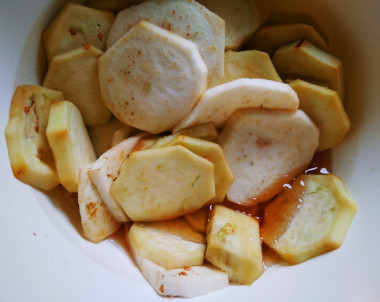 Нарежьте баклажан небольшими брусочками, по желанию можно нарезать сначала кружочками, затем каждый кружочек разрезать пополам. Замочите баклажан в солёной воде, это позволит избавиться от горечи и далее, в процессе обжаривания, баклажан будет впитывать меньше масла.