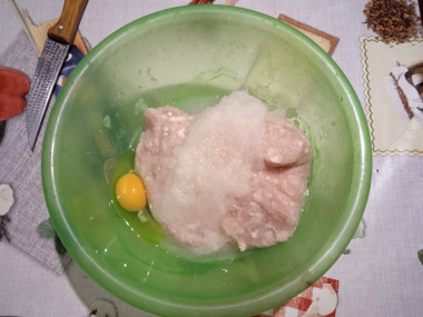 Затем добавьте яйцо, соль и специи. Всю массу хорошо перемешайте. В качестве специи можно воспользоваться черным молотым перцем и сушеными травами или же воспользоваться готовым набором специи для мяса.