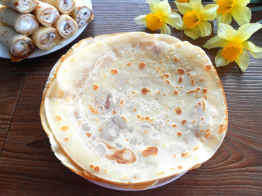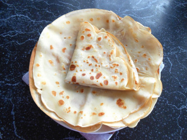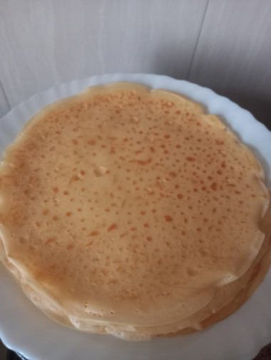 Делала всё чётко по рецепту без изменений. Тесто приготовила очень быстро, оставила его на 10 минут и с легкостью обжарила тоненькие блинчики. У меня получилось 13 штук. Первый блинчик сразу слопал ребёнок) уж больно вкусно пахло)))