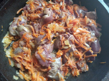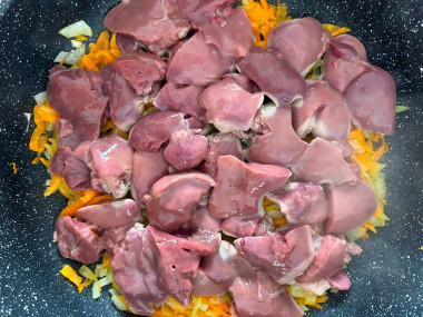 Куриную печень промойте под проточной холодной водой и обсушите бумажными салфетками или полотенцем. Срежьте при необходимости с печени жир и прожилки. Порежьте крупные кусочки печени поменьше, а маленькие можно не нарезать. Выложите нарезанную куриную печень в сковородку к обжаренным овощам.