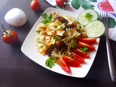 Куриную печень с макаронами подавайте горячими. Это самостоятельное блюдо, которое отлично подойдёт для семейного ужина. При подаче макароны можно посыпать свежей рубленной зеленью и предложить салат из свежих овощей. Приятного аппетита!