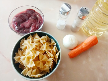 Калорийность продуктов: Куриная печень, Макароны, Морковь, Лук, Соль, Перец черный молотый, Растительное масло