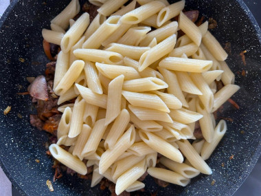 Готовые макароны добавьте к обжаренной с овощами куриной печени и всё очень хорошо перемешайте, чтобы все макароны впитали вкус и аромат приготовленного блюда.