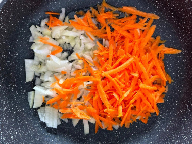 Лук и морковь помойте и очистите. Лук не крупно порежьте, морковь натрите на крупной тёрке или тоже мелко порежьте. Сковороду поставьте на огонь, прогрейте. Налейте растительное масло, выложите измельчённые овощи и обжаривайте их на сильном огне, постоянно помешивая, до прозрачности лука. О том, как подобрать идеальную сковороду, а также как правильно выбрать растительное масло, читайте в отдельных статьях, ссылки в конце рецепта.