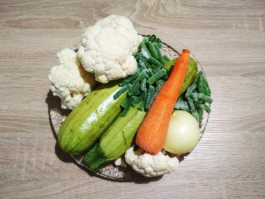 Как сделать овощное рагу с цветной капустой и кабачками? Подготовьте указанные ингредиенты. Овощи предпочтительней брать свежие. Если используете замороженные овощи, то их размораживать не нужно. Помидоры я использую в собственном соку нарезанные без шкурки, если используете свежие помидоры, то к ним можно добавить 1 ч.л. томатной пасты для насыщенности вкуса.