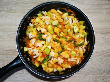 Кабачки промойте под проточной холодной водой, нарежьте кубиками и добавьте к овощам в сковороде, продолжайте тушить под крышкой ещё 6 - 8 минут.