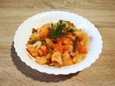 С удовольствием приготовила овощное рагу с цветной капустой, и ещё с большим удовольствием съели его всей семьей за обедом. Из необходимых продуктов у меня не было лишь сельдерея. Продукты для рагу не взвешивала, брала в произвольном количестве, поэтому в моем рагу доминирует сладковатый привкус моркови и кабачка. На мой вкус, в блюдах с цветной капустой главное её не разварить, люблю, чтобы она была слегка тверденькой, поэтому добавила её в блюдо последней, после чего готовила не долго, минут 6-7, затем блюдо дошло под крышкой. Очень вкусно, свежо и ароматно! Специи не добавляла, но можно было присыпать щепоткой тимьяна. Спасибо, рецепт отличный!