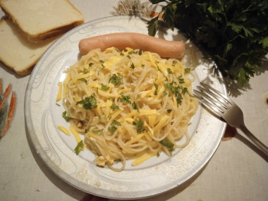 Решила сделать спагетти на ужин и нашла отличный рецепт на любимом сайте. Приготовила спагетти с сыром в сливочном соусе по этому рецепту. Делала на сковороде соус, а параллельно варила спагетти. Очень удобно. Для соуса сначала обжарила на сливочном масле дольки чеснока, после добавила сливки и ввела сыр. Плавленый сыр использовала голландский. Уваривала соус не долго, он получился средней густоты. Чеснок не вынимала и не измельчала. Добавила отваренные спагетти в соус и немного потомила. От себя ещё положила щепотку мускатного ореха. Аромат превосходный. Готовить блюдо считанные минуты, а результат великолепный. Из простых продуктов получился невероятно вкусный ужин. Спагетти с сыром в сливочном соусе подавала с сосисками и овощным салатом. Спагетти вышли нежными, ароматными и очень аппетитными. Перед подачей я посыпала ещё спагетти натертым сыром и зеленью для красоты. Хорошо, что чеснок не убрала из соуса. Это очень оригинально и придает особую изюминку блюду. В следующий раз я положу побольше чеснока) Ну, очень вкусно! Огромное спасибо автору 😊