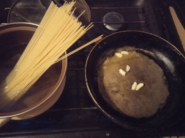 В сковороде на среднем огне разогрейте сливочное и растительное масло. Добавьте зубчики чеснока и обжарьте до румяного цвета и появления яркого чесночного запаха. После этого чеснок выньте из сковороды. Огонь убавьте до минимального. Если вы хотите оставить чеснок в соусе, но нужно мелко его порубить или пропустить через пресс. И также обжарить до легкого золотистого цвета. Важно следить, чтобы чеснок не сгорел.