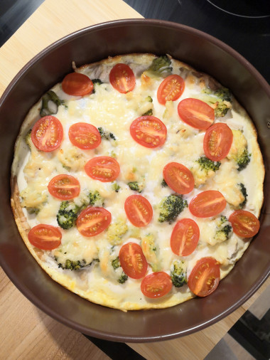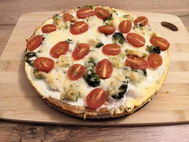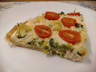 С коржа уберите груз и выпекайте еще 10 минут при той же температуре. Затем выложите на него начинку - половину сыра, курицу, брокколи и помидоры.