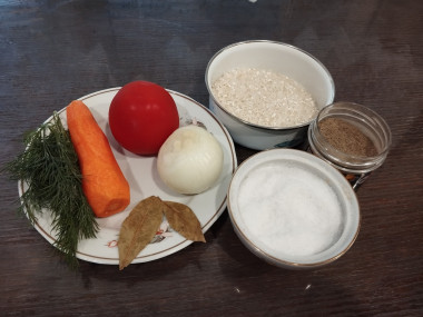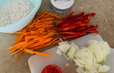 На гарнир приготовила овощной плов с овощами. Из овощей я использовала лук,морковь и помидор. Лук порезала полукольцами, морковь натерла на крупной тёрке, помидорку порезала небольшими кубиками. Следуя рецепту автора, получилось вкусное блюдо. Еще добавила немного измельчённую зелень укропа. Совсем несложно готовить, а результат порадовал.