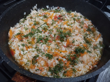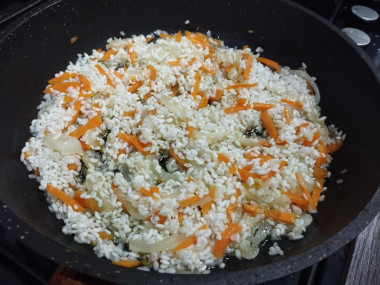 С риса слейте воду. Равномерно распределите его по овощам. Накройте казан крышкой и оставьте на пару минут. Рис за это время впитает в себя масло от овощей, что поможет стать ему в дальнейшем рассыпчатым и золотистым.