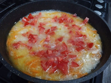 Через 5 минут положите помидоры, их надо равномерно распределить по поверхности риса. Также положите лавровый лист, соль и перец.