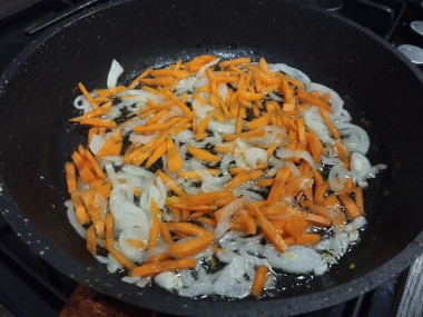 Следом за луком положите морковь. Огонь не убавляйте. Овощи, обжаренные на сильном огне, получаются особо ароматными. Жарьте морковь примерно две минуты. Не забывайте перемешивать ее.