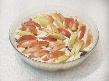 Когда пирог охладится, достаем его и на тесте дольками выкладываем яблоки, немного углубив кусочки в тесто.