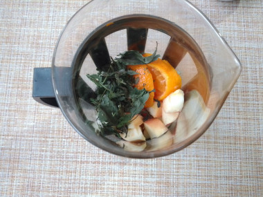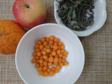 Сделала с утра пунш безалкогольный в домашних условиях. Для его приготовления взяла яблоко, мандарин, замороженные ягоды облепихи. Всё помыла, яблоки очистила от семян, кожуру с мандаринов не