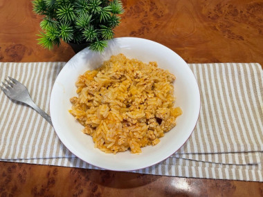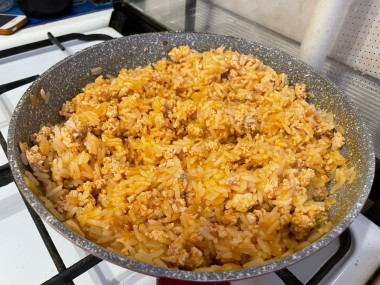 Когда рис будет готов, перемешайте его с фаршем. Выключите огонь и подержите еще немного под крышкой, чтобы рис еще больше распарился. Готовое блюдо выложите на тарелку и подавайте к столу в горячем виде. Приятного аппетита!