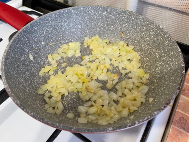 Лук очистите от шелухи и мелко нарежьте. На горячую сковороду налейте немного растительного масла и выложите измельченный лук. Обжаривайте его в течении 1-2 минут на среднем огне, пока он не станет прозрачным.