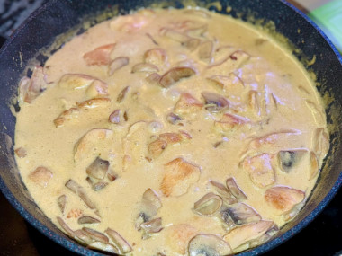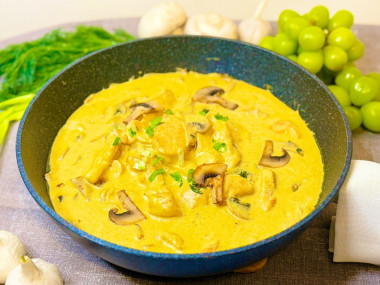 Первым делом подготовила все ингредиенты по списку. Замешала соус из сливок, соли, перца и кари. На сильном огне обжарила шампиньоны. Убрала грибы в отдельную тарелку. На той же сковороде обжарила куриную грудку, подлила ещё масло. Курицу жарила на среднем огне, чтобы она успела приготовиться. Старалась добиться корочки. Добавила рубленный чеснок, через 3 минуты грибы, соус и немного воды (150 мл), так как хотелось больше соуса. Тушила 10 мин под крышкой. Благодаря муке соус стал гуще. Вмешала сыр, накрыла крышкой, выключила огонь и оставила доходить на остывающей плите.