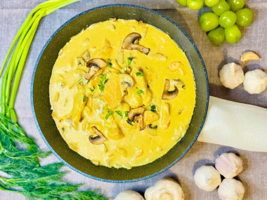 Рецепт понравился мне тем, что все готовится на одной сковороде. Прекрасный ужин, сочетающий в себе сливочный соус, пряность карри, сытость курицы и грибов. Благодарю за рецепт, вроде бы просто, но вкус интересный, благодаря сочетанию ингредиентов.