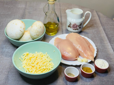 Как потушить куриную грудку с грибами и сыром на сковороде? Подготовьте продукты. Мясо лучше возьмите охлажденное, если же у вас замороженное, то предварительно разморозьте его, переложив из морозилки на нижнюю полку холодильника. Помимо шампиньонов можно использовать любые другие грибы: вешенки, лисички, белые или смесь грибов, как свежих, так и замороженных.