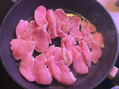 Куриную грудку промойте, обсушите и нарежьте поперек ломтиками.