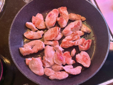 В сковороду, где жарились грибы, выложите куриную грудку. Жарьте ее, помешивая, до золотистого цвета.